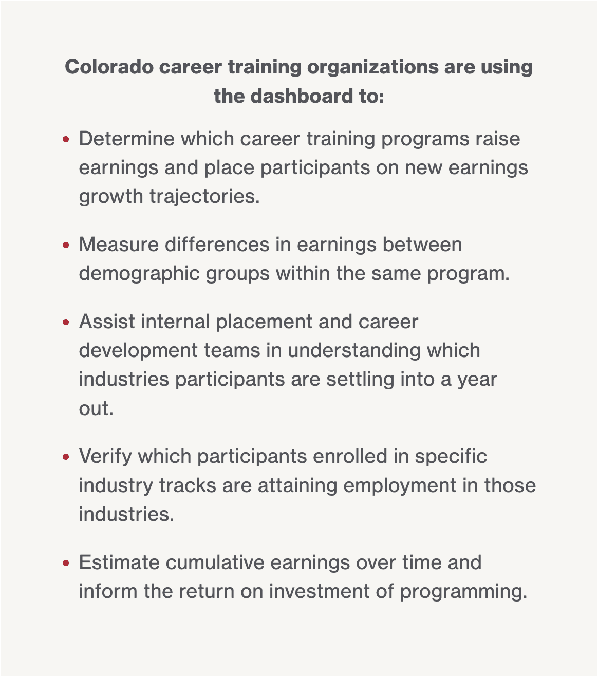 The government of Colorado, University of Denver, and state-wide organizations were gathering employment data. Their shared goal: understand the impact of different programs on people’s professional development. Each group has a different need for this data, be it allocating funds or iterating programming.